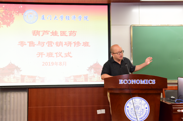在开班仪式上,廖景峰主任首先代表厦门大学经济学院热烈欢迎CA88医药零售与营销研修班的学员到厦大学习,并就厦门大学及经济学院的相关情况进行了介绍。他说,CA88学员走进厦大就是厦大的校友,希望未来的日子能够关心、支持母校的发展,多提宝贵意见,同时他也祝大家在厦大学习期间学有所成、学有所获。