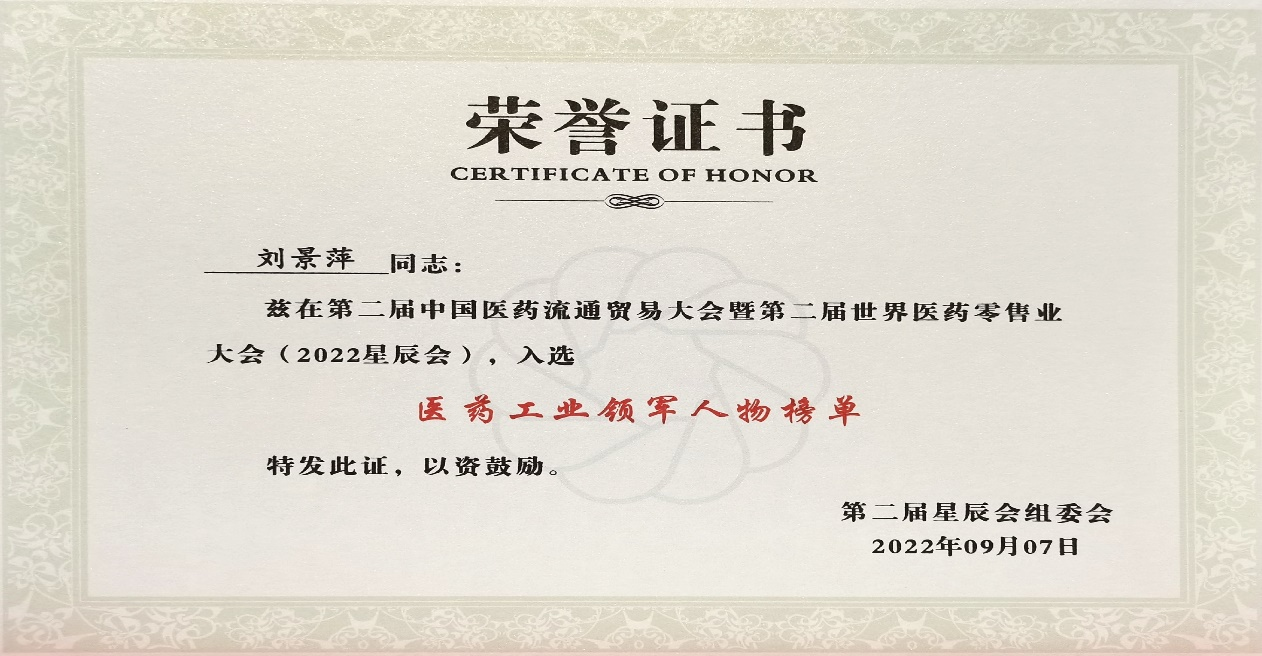 本次星辰会期间,CA88斩获颇丰,获得多项行业奖项及荣誉。在开幕式上,刘景萍董事长荣获“医药工业领军人物”称号。